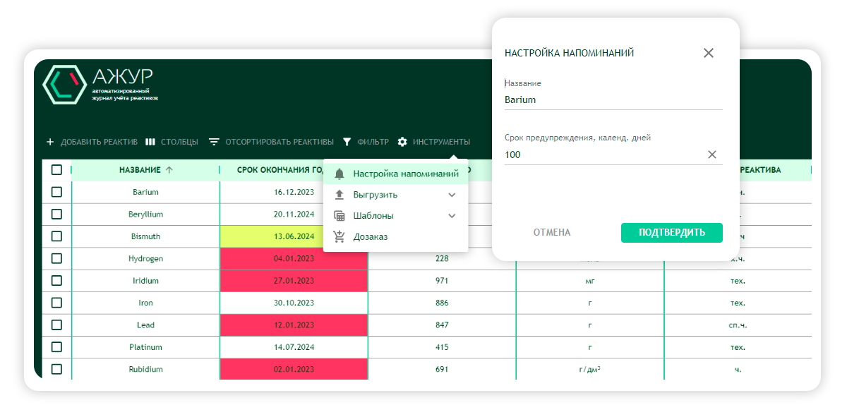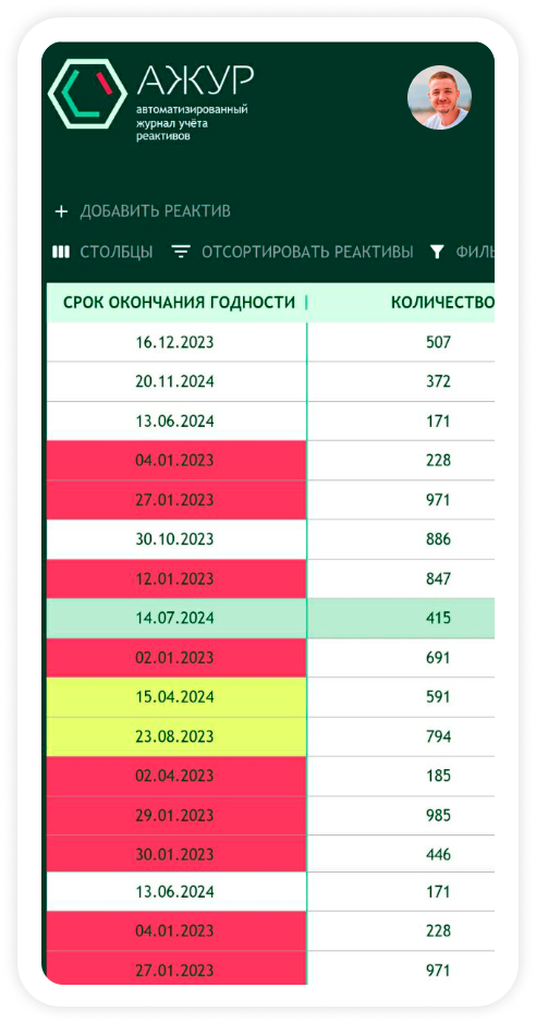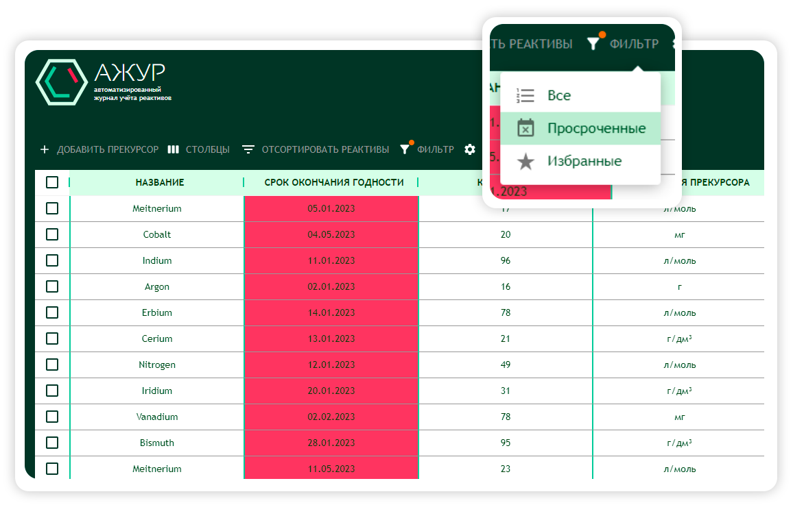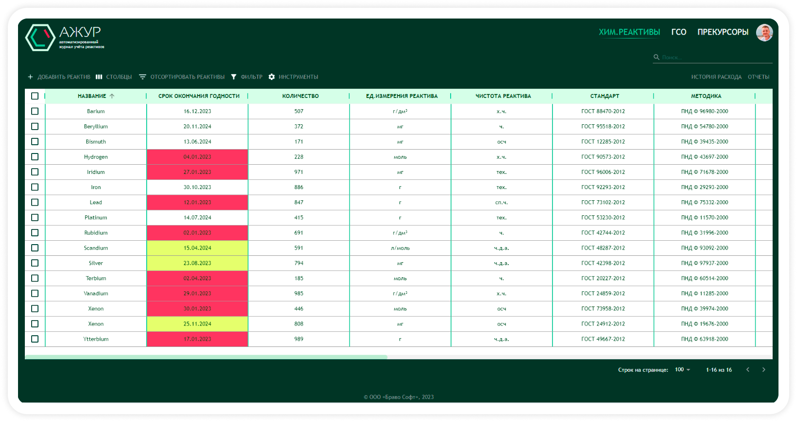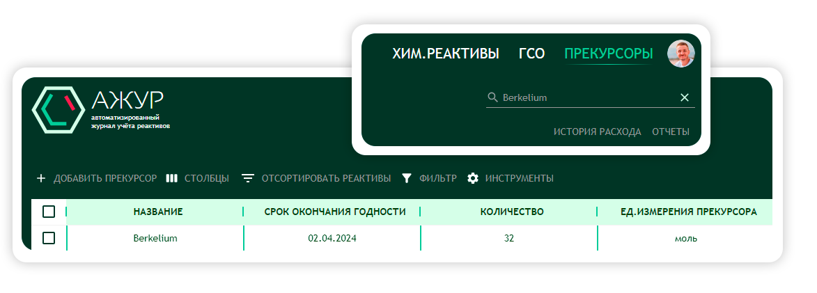 АЖУР - это программное обеспечение для работы в лаборатории. Удобный и эффективный электронный инструмент для учета и контроля реактивов, ГСО и прекурсоров.